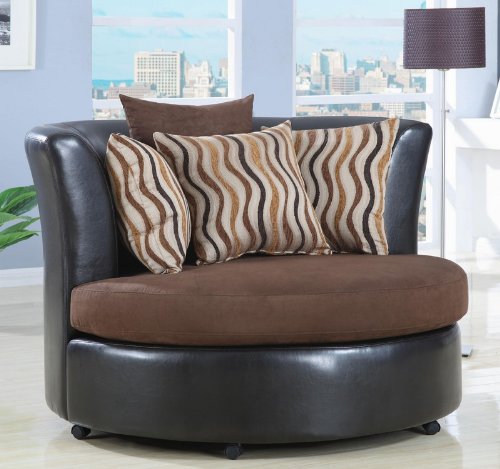 - Enjoy this round cuddle chair, which features durable microfiber upholstered seat in a chocolate color, as well as durable leather like vinyl trim.